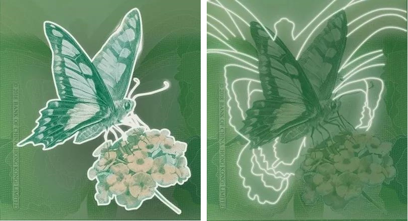 背面以香港珍稀、顏色耀目嘅寬帶青鳳蝶為主景,於馬纓丹上展示優雅形態,襯以蝴蝶翅膀嘅剪影為背景: